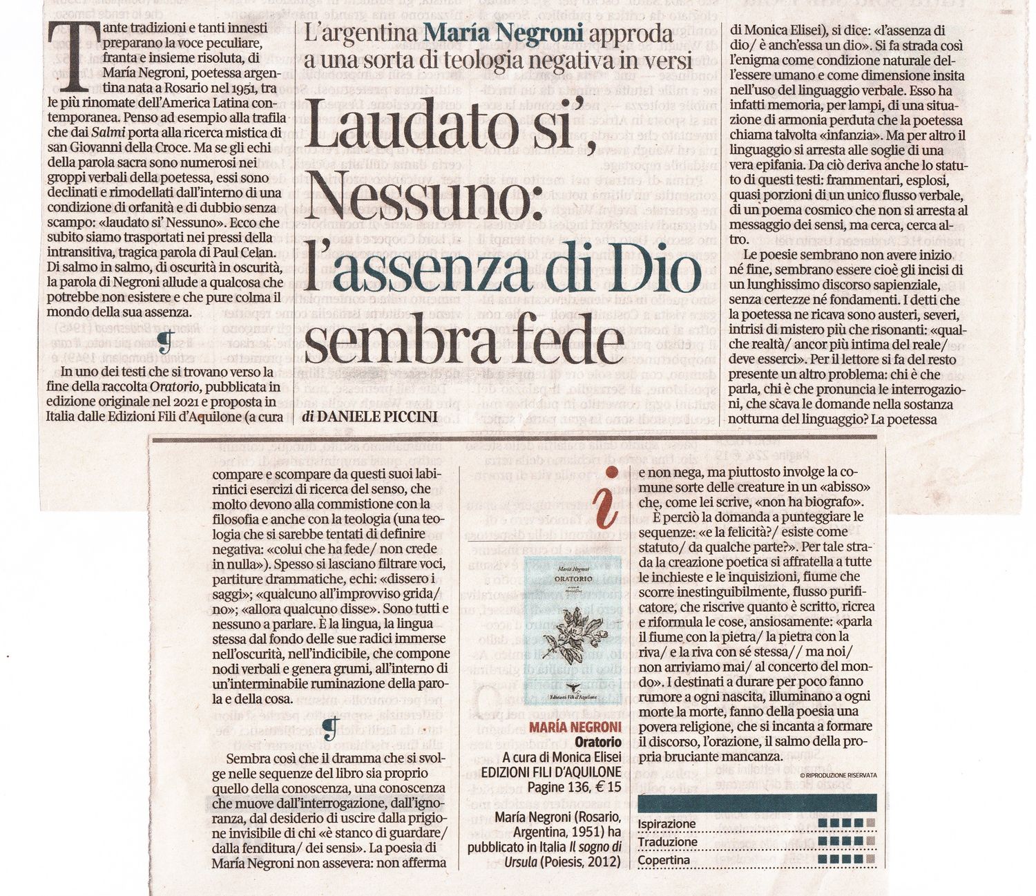 LAUDATO SI’, NESSUNO: L’ASSENZA DI DIO SEMBRA FEDE L’argentina Maria Negroni approda a una sorta di teologia negativa in versi